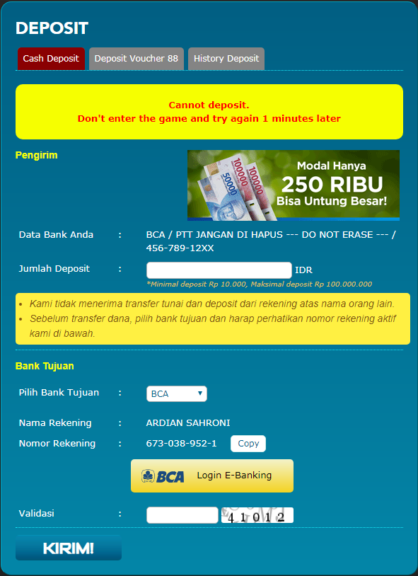 - Jika anda ingin lancar dalam proses DEPOSIT harap mengirim dana dalam angka unik di setiap deposit. Contoh : Rp. 500.879, Rp 50.247, Rp. 84.987 dan sebagainya. Ini berguna untuk kami melihat secara cepat deposit anda